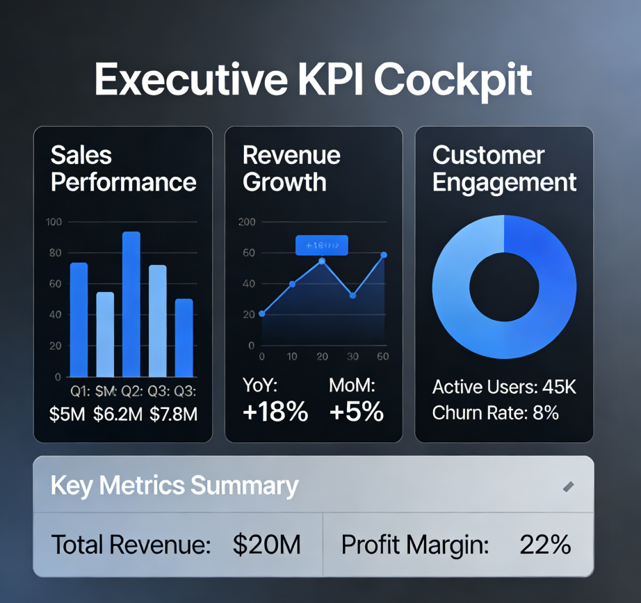 Say goodbye to cluttered Excel spreadsheets and lengthy PowerPoint presentations. We will construct a personalized “Executive KPI Cockpit” exclusively for you. This dynamic, real-time data dashboard condenses your company’s 20 most critical health metrics—such as Customer Acquisition Cost (CAC), active user rates, and revenue trends—onto a single screen. With just a glance each morning, you can instantly grasp your company’s operational status—much like checking a car’s dashboard—making your decision-making intuitive and agile.